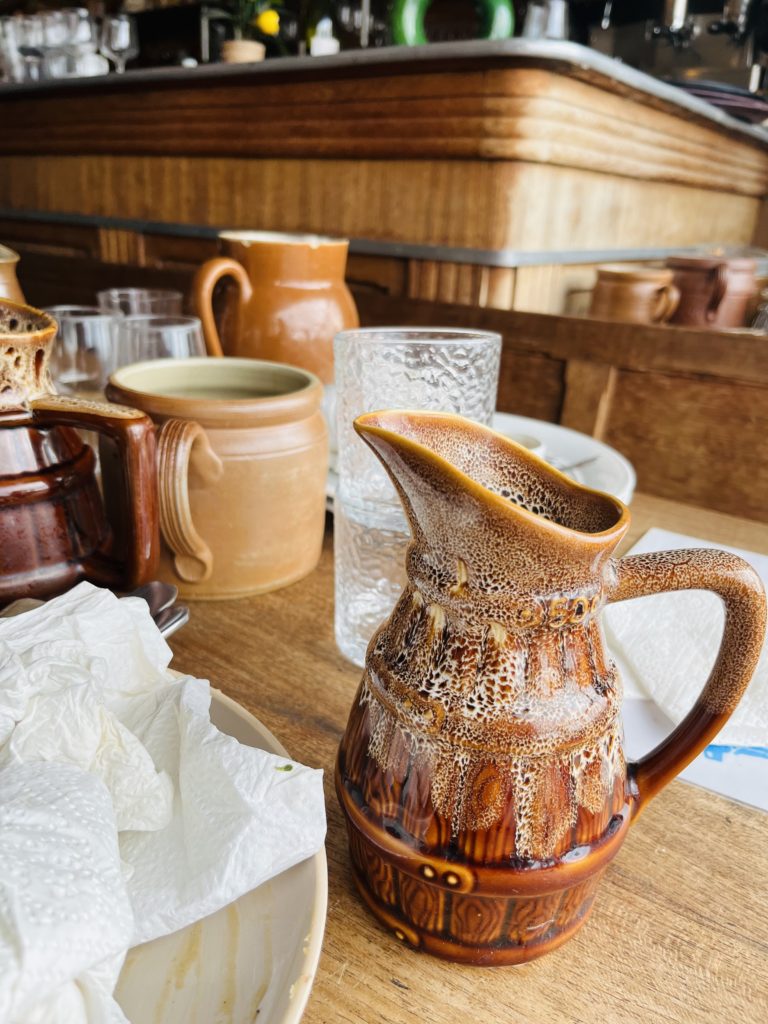 Die Getränkeauswahl ist bescheiden, aber vollkommen ausreichend. Ein kühler Weißwein, ein ehrlicher Cidre, Wasser, das in rustikalen Tonkrügen gereicht wird. Genug, um diesen Ort zu feiern. Genug, um die Freude zu unterstreichen.