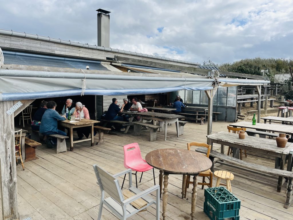 Die langen massiven Bänke stehen ohne Ordnung im Sand. Kein Möbelstück gleicht dem anderen. Die Bretter sind verwittert von Wind und Meer, glattgescheuert von vielen Sommern. Man sitzt mit baumelnden Beinen, die Zehen graben sich in den warmen feuchten Sand. Jeder Schritt über den Boden lässt alte Fliesen knistern, vermischt mit dem Streusand, der hinein geweht wird.