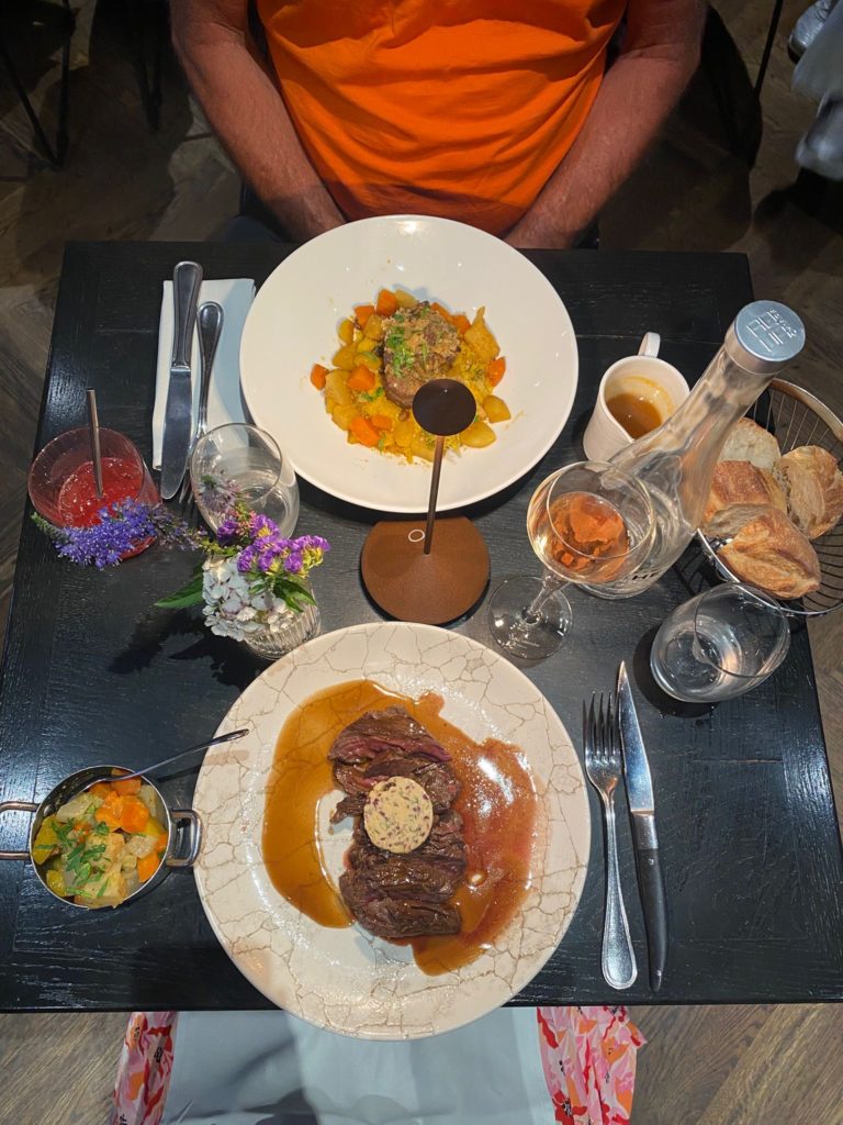 Wir entscheiden uns für das „Hache“, eine Empfehlung aus dem Bauch heraus und eine Entscheidung aus dem Herzen. Auf den Tellern, Lammschulter, langsam geschmort, mit einer Jus, die vermutlich direkt vom Himmel getropft ist, und das Nierenstück vom Rind, perfekt rosa, begleitet von samtigem Selleriepüree. Und natürlich dürfen sie nicht fehlen. Vorab Schnecken mit viel Knoblauch und Petersilie, und Froschschenkel, außen knusprig, innen zart, fast wie Hühnchen mit französischem Diplom. Das eine ist das Essen, zitiere ich einen Blogbeitrag von freidurchatmen.de, das andere ist die Gastfreundschaft. Und tatsächlich, ein Lächeln mehr, eine Gabel weniger hektisch. Hier wird Zeit noch als Zutat verstanden.
