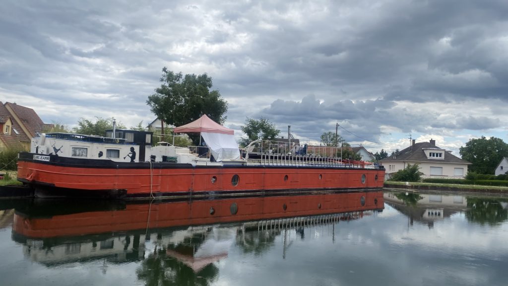 Die Nacht beginnt mit einem Knirschen, nicht unter dem Reifen, sondern in meinem Inneren. Es ist das Geräusch enttäuschter Gutgläubigkeit. Meine Powerbank wurde gestohlen, im Sanitärgebäude, beim Laden. Der Strom war gratis, die Moral offenbar auch. Die nahe Autobahn sorgte derweil für die musikalische Untermalung der unruhigen Nacht. Wer braucht schon Zikaden, wenn es eine Renault-Twingo-Fanfare gibt. Und doch beginnt der nächste Tag mit einem kleinen Triumph. Morgendliches Stromcatching an einem der wenigen CE-kompatiblen Steckplätze. Unser blauer Adapter, ein Held in Steckerform, rettet das Kaffeewasser. Die Rezeption war beim Thema Stromversorgung so ahnungslos wie ein Kamel im Schneesturm. Doch mit einem Lächeln und einer dampfenden Tasse schauen wir Richtung Osten, dem Kanal folgend. Wir verlassen Colmar, schnurgerade geht es dahin. 37 Kilometer Richtung Straßburg. Die Landschaft wirkt wie ein einziger, gedehnter Atemzug. Der Kanal zieht sich lang wie ein Gedanke ohne Punkt. Immer wieder rollen Reifen über die Wege, schleudern Brombeeren, Himbeeren, Kirschen und was der Sommer sonst noch so fallen lässt gegen unsere Waden. Ein süßer Duft nach nassem Holz, warmem Asphalt und frühen Walnüssen hängt in der Luft. Die Insekten feiern Party, und wir sind die Tanzfläche. Unter einem alten Nussbaum machen wir Halt. Seine Krone wiegt sich im Wind, großzügig wie ein Großvater mit vollen Taschen.